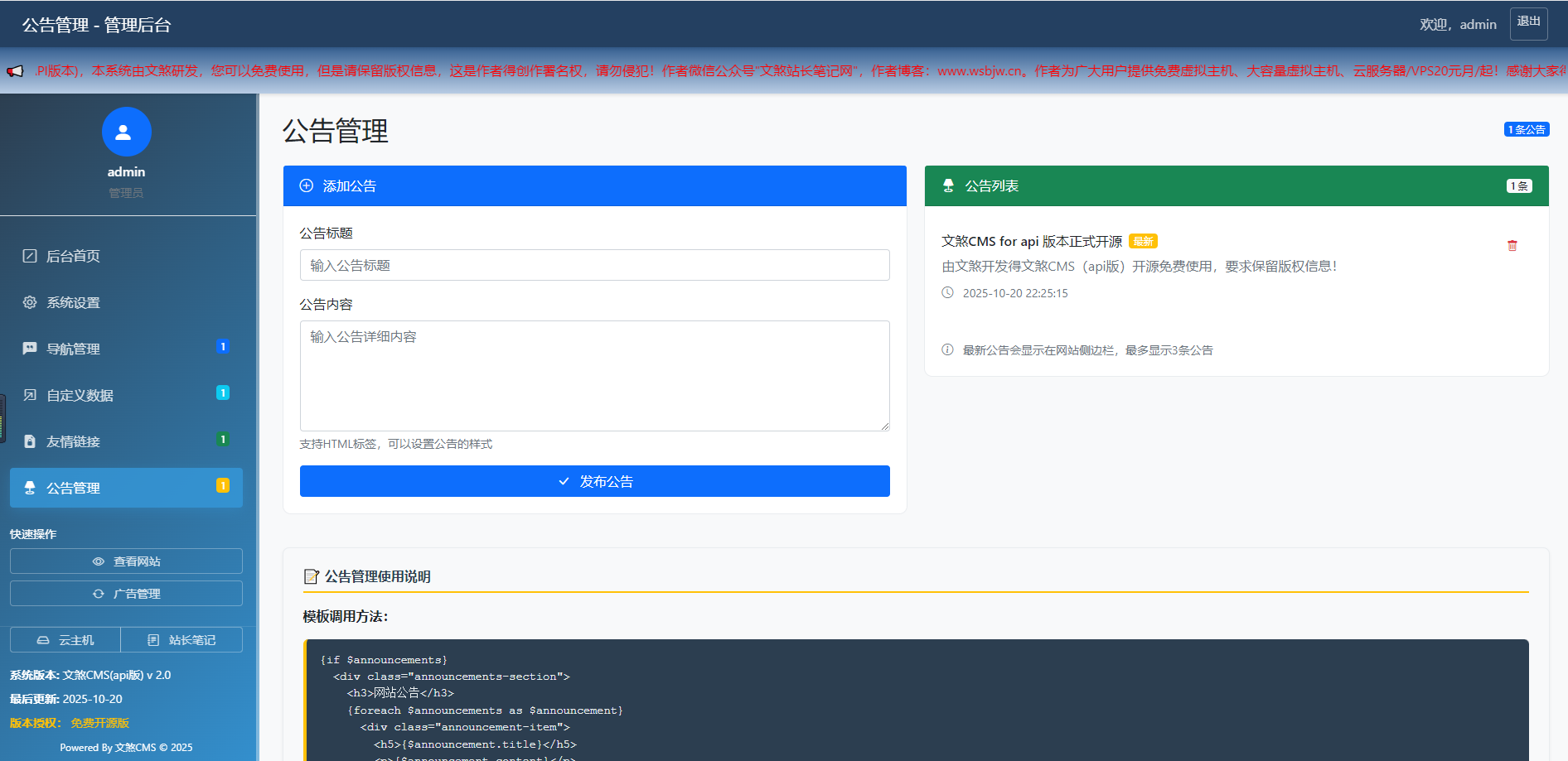 模板化调用:内置模板调用示例(公告、友情链接、自定义数据等),开发者可直接复制代码到模板,无需复杂编码;